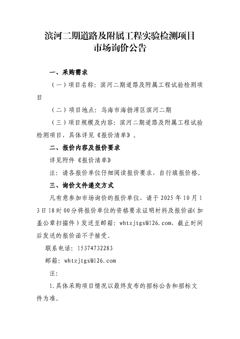 濱河二期道路及附屬工程實(shí)驗(yàn)檢測項(xiàng)目市場詢價(jià)公告